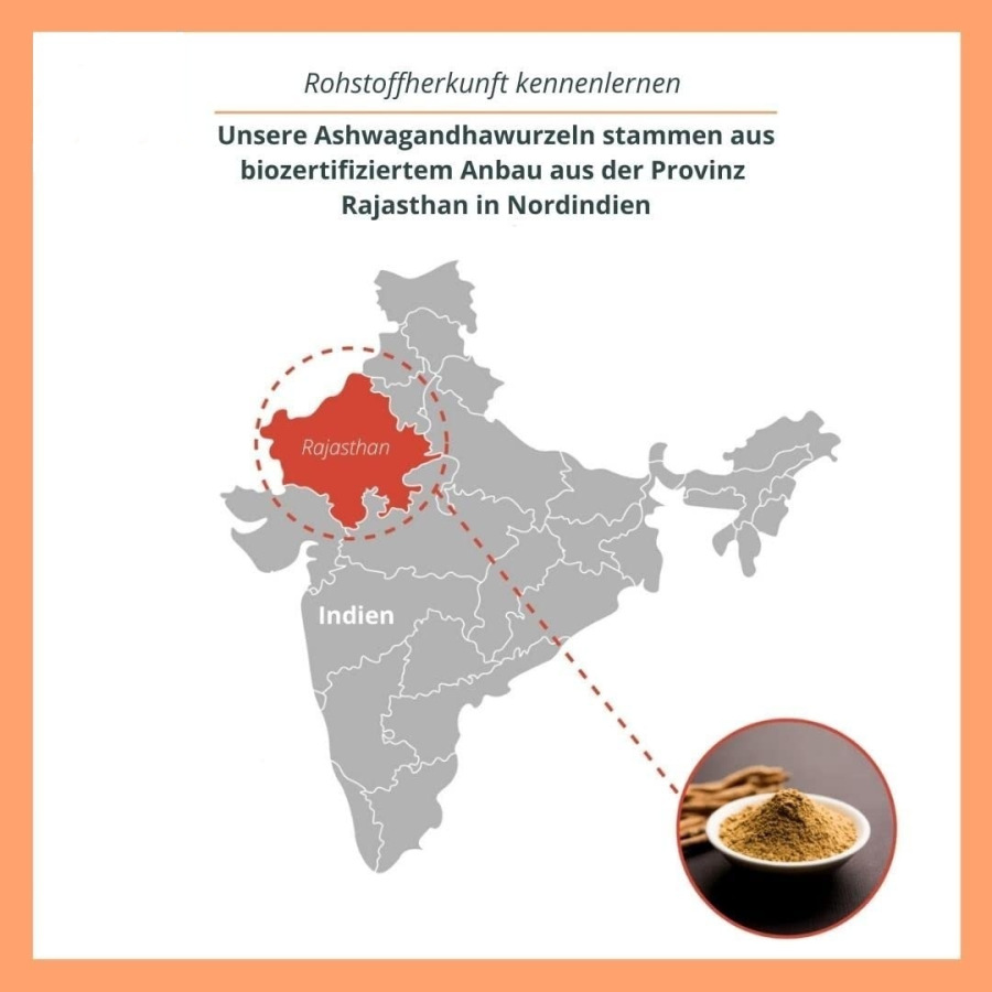 Naša ashwagandha pochádza z najznámejšieho indického regiónu na pestovanie ašvagandy - provincie Radžastán. Špeciálne pôdy, dômyselné podklady a klimatické podmienky v nedotknutej prírode tejto oblasti zabezpečujú jedinečný obsah živín a obzvlášť silnú koncentráciu aktívnych rastlinných látok. Naša ashwagandha pochádza z čisto organického pestovania našej partnerskej spoločnosti certifikovanej EÚ-BIO.